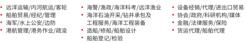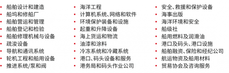 展会设船企展区、国际展区、邮轮产业展区、邮轮(客船)内装展、船用设备及先进材料展区、船舶通导展区、海上风电展区、海洋牧场展区、港口及航运服务展区,全面展示海事行业新产品、新技术、新服务。