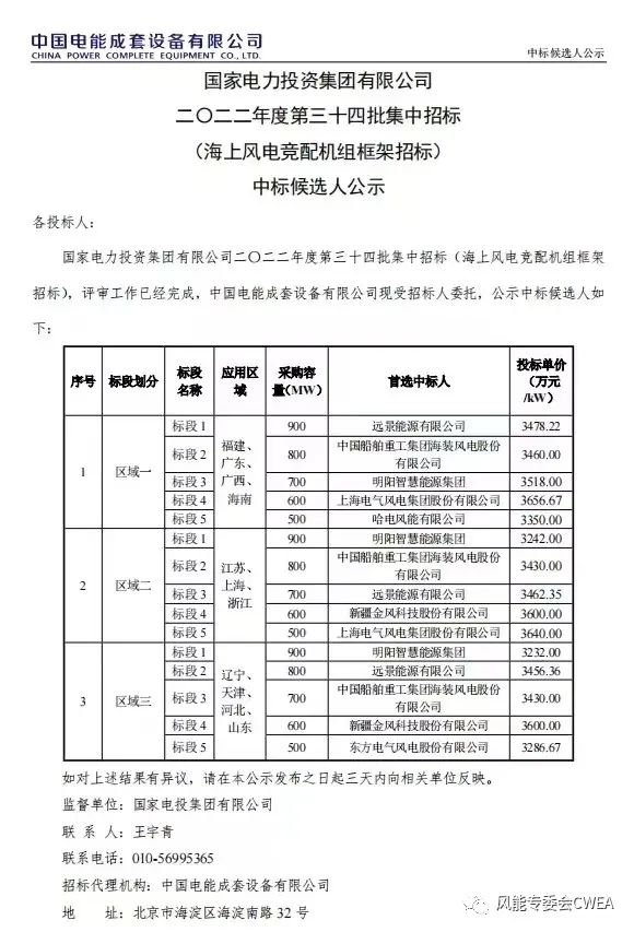 同日,国家电投另一个海上风电项目——广东湛江徐闻海上风电场 300MW 增容项目风力发电机组设备中标候选人公示,明阳智能预中标,投标报价104040万元,折合单价3468元/kW。