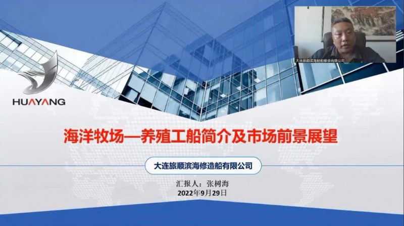 深耕船舶修造行业25年的大连旅顺滨海修造船有限公司总经理张树海线上参会,他简要介绍了滨海船厂的发展历程,并且对海洋牧场三文鱼养殖工船和养殖工船市场前景进行了重点介绍与分析。