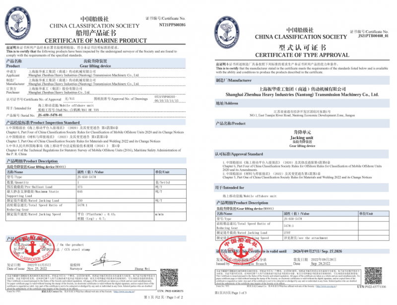 11月25日,振华重工自主研制的第四代风电安装船用齿轮升降装置获中国船级社颁发的该类产品国内首张产品证书,这也是继9月获得国内首张齿轮升降装置系列产品型式认可证书后,获得的又一项国内第一认证。该证书的取得标志着由ZPMC自主研发制造的国内首套第四代风电安装船用齿轮升降装置成功交付。
