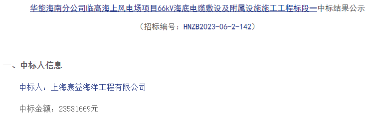 7月24日,华能海南分公司临高海上风电场项目66kV海底电缆敷设及附属设施施工工程标段一、标段二以及220kV海底电缆敷设及附属设施施工工程标段三中标结果进行公示。