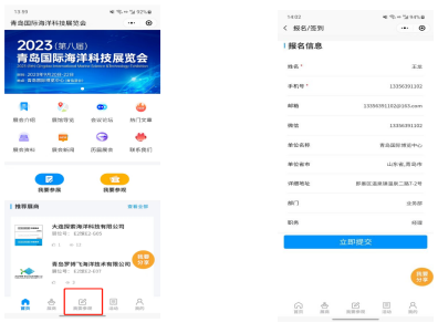 点击展商秀底边栏中央的【我要参会】按钮,直接报名参加青岛海科展,避免现场登记注册麻烦。提前预登记的观众还可以享有免费午餐等展会特权!
