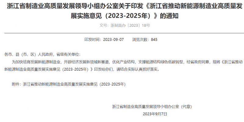 浙江省制造业高质量发展领导小组办公室关于印发《浙江省推动新能源制造业高质量发展实施意见(2023-2025年)》的通知