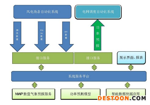 本系统包括硬件终端设施与国能日新自主研发的风电预测软件系统。通过采集数值气象预报数据、实时测风塔数据、实时输出功率数据、风电机组状态等数据,完成对风电场的短期风电功率预测、超短期风电功率预测工作,并向电网侧上传测风塔气象数据和风功率预测数据。