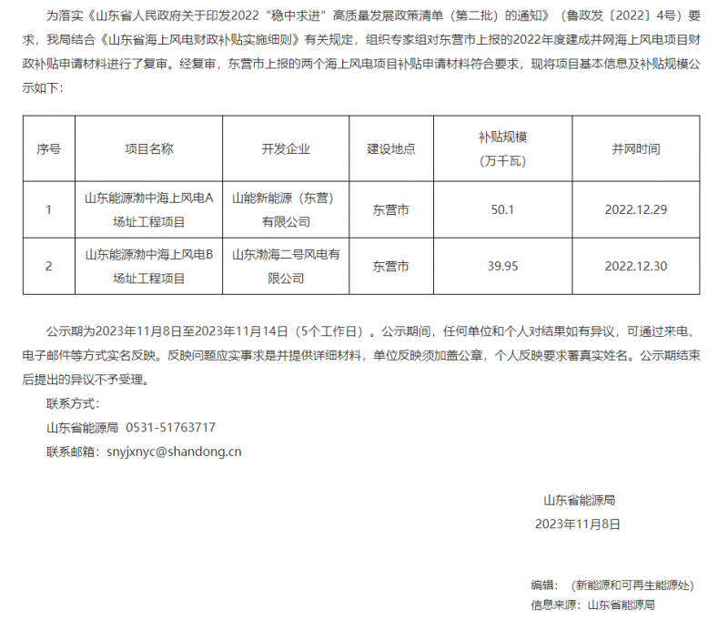 山东省海上风电项目补贴公告