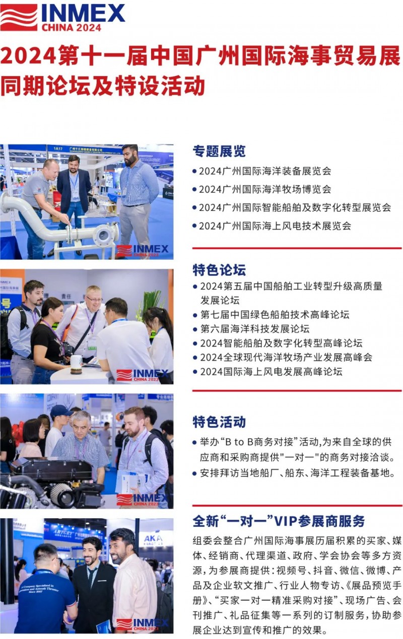 广州国际海事展 INMEX China 2024将设置:国际展区、船企展区、船用设备及先进材料展区、船舶通导展区、邮轮产业展区、海洋装备展区、海洋牧场展区、海上风电展区、智能船舶及数字化转型展区。