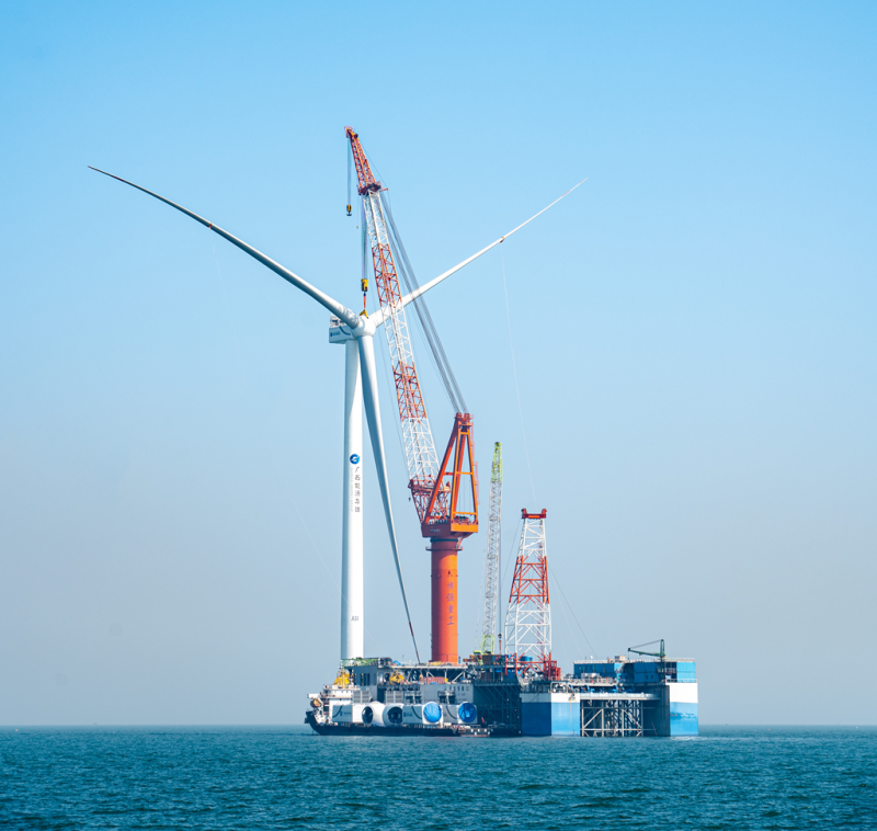 防城港海上风电示范项目是我国在建单体装机容量最大、国内首个零补贴的平价海上风电项目,由广投集团旗下广西能源集团控股的广西本土唯一能源上市企业——广西能源股份公司投资建设。项目于2023年3月全面启动,6月海上工程全面开工,8月首台风机完成吊装,11月完成海上升压站吊装,2024年1月由南方电网广西电网公司建设的220千伏海上风电送出线路工程送电投产,为海上风电项目并网发电提供有力的能源通道支撑。
