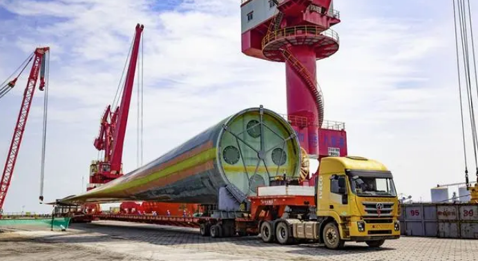 5月7日上午12时,在中海化学八所港第一装卸区六号泊位,随着指挥手一声令下,长度惊人的叶片被400吨汽车起重机和1000吨桅杆式起重机从平板车吊至“华标海洋”货轮上的预定焊接支架位置,标志着全球最长海上风电叶片首次装船作业顺利完成。据了解,该叶片长达143米,重达60余吨,系全球已下线长度最长的风电叶片,由明阳智慧能源集团股份公司东方基地制造,即将运往广东阳江鉴衡阳江国家质检中心进行检测。