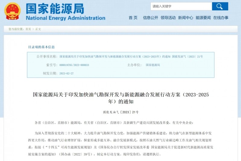 能源行业是中国实现“双碳”目标的重点领域。2023年2月,国家能源局制发《加快油气勘探开发与新能源融合发展行动方案(2023-2025年)》。