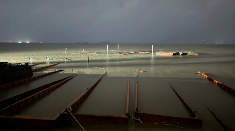 华电重工温岭滩涂光伏项目团队实施了一系列针对性的防台措施,其中包括水陆两栖桩机上岸避风,动力运输工装驶入船厂避风,以及无动力运输工装注水坐滩并加固系缆以确保稳定。起重船“满洋5020”也通过抛锚压水坐滩方式进行防台。此外,堆场和临建设施已加固,以抵御台风带来的强风暴雨。