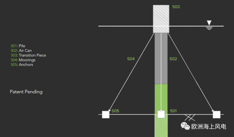 FRP单桩结合了固定式与漂浮式技术,主要由一体式带空气储罐的单桩、带荷载环的过渡段、系泊系统组成,最大适用水深达100米。单桩和系泊设备约束了6个自由度上的运动。