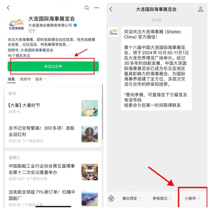 关注"大连国际海事展览会"微信公众平台,点击"小程序"菜单即可进入页面。
