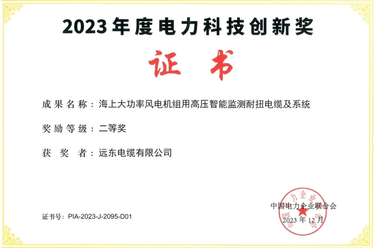 今年4月,中国电力企业联合会发布2023年度电力创新奖获奖名单,远东电缆有限公司“海上大功率风电机组用高压智能监测耐扭电缆及系统”荣获2023年度电力科技创新奖。值得一提的是,远东风力发电用电缆已连续多年入选全国“制造业单项冠军”。