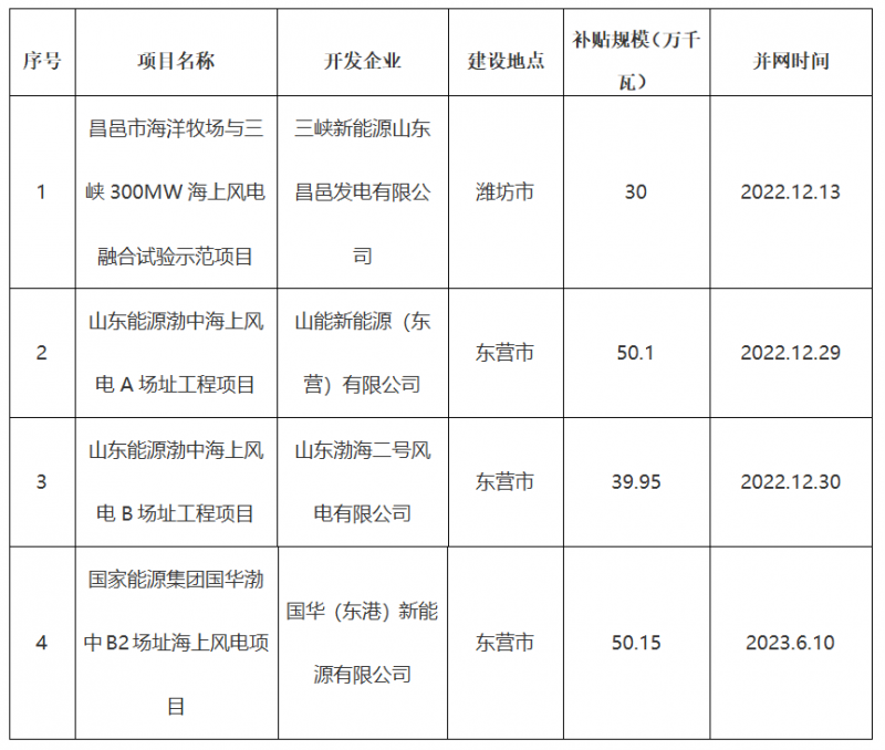 为落实《山东省人民政府关于印发2022“稳中求进”高质量发展政策清单(第二批)的通知》(鲁政发〔2022〕4号)等要求,我局结合《山东省海上风电财政补贴资金管理办法》(鲁财建〔2024〕23号)等文件有关规定,组织专家组对潍坊、东营市上报的2022-2023年度建成并网海上风电项目财政补贴申请材料进行了复审。经复审,潍坊、东营市上报的四个海上风电项目补贴申请材料符合要求,现将项目基