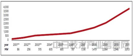 其中海上发电设备一年设置了97万千瓦,到2011年年底累计设置410万千瓦。在410万千瓦中,有381万千瓦设置于欧盟。剩余的基本是中国进行的实证业务,欧盟创造了海上风力发电的历史。资料1表示了欧盟海上风力发电装机容量的变化,可以看出正顺利增长。