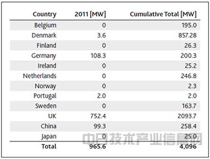 | 资料2.全球海上风力发电装机容量(2011年,累计)(出处) GWEC – Global Wind 2011 Report |