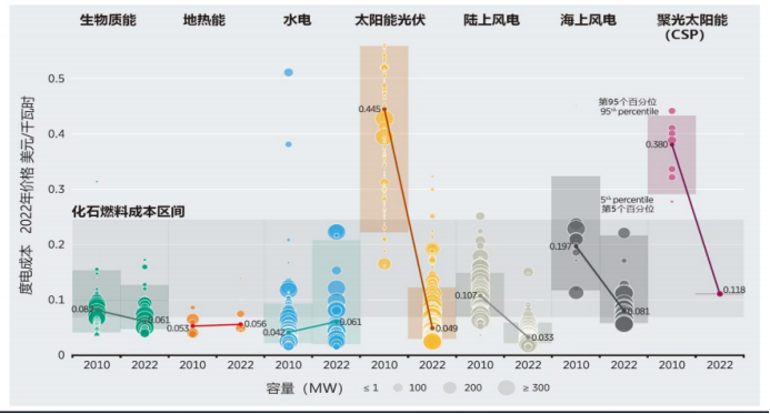 我国已建立了成熟的风电产业链,也是风电大部分零部件和材料的最大生产基地。截至2023年,我国风电国内品牌机组累计出口1559万千瓦,遍布50多个国家,其中发电机、轮毂、机架、叶片、齿轮箱、轴承等关键零部件的产量占全球市场的60%~70%。在全球规模应用的驱动下,风力发电成本大幅下降,2022年陆上风电的度电成本比2010年的1.5元降低了近10倍,陆地风力发电是目前所有清洁能源中度电成本最低的,具有非常强的竞争力。
