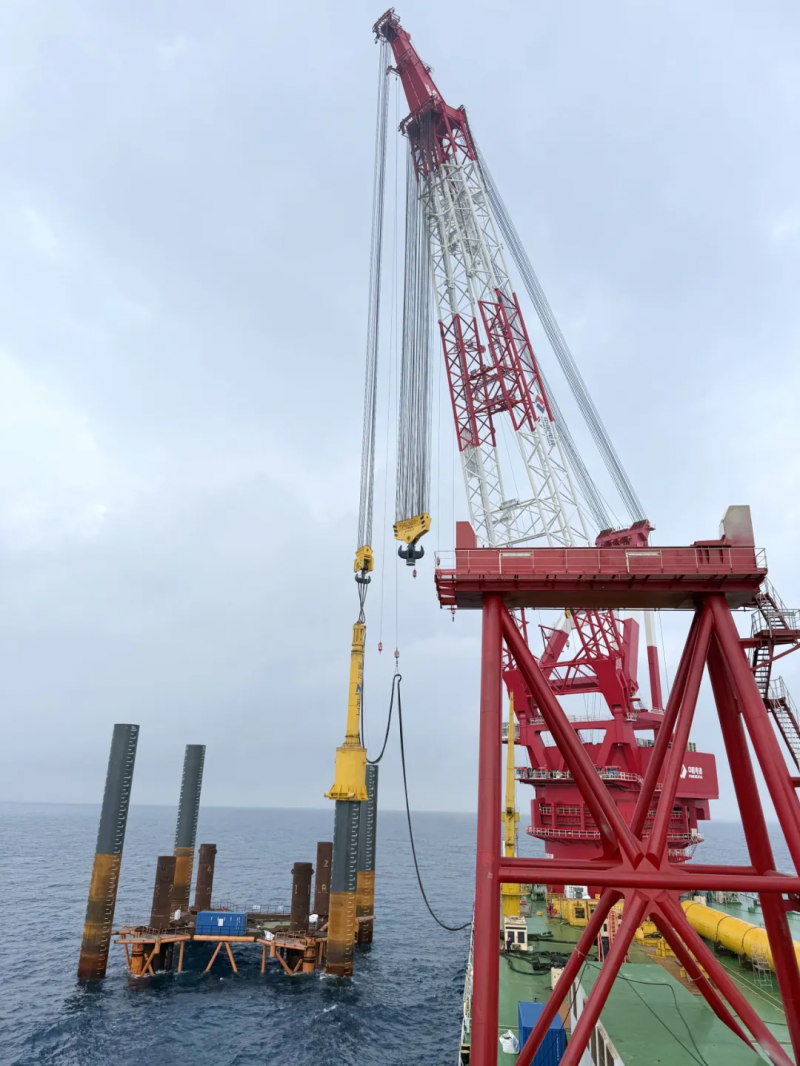 该船还完成了海上首吊作业,顺利起吊重量超1000吨沉桩定位架,将钢管桩精准打入海底,并完成了风机基础打桩工作。作业过程中,起重机各项性能表现优异。