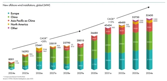 预计年均复合增长率(CAGR)在2024年到2029年为28%,在2030年到2034年为15%,这意味着海上风电行业在2030年将实现新增装机30GW以上,并在2033年突破50GW大关。