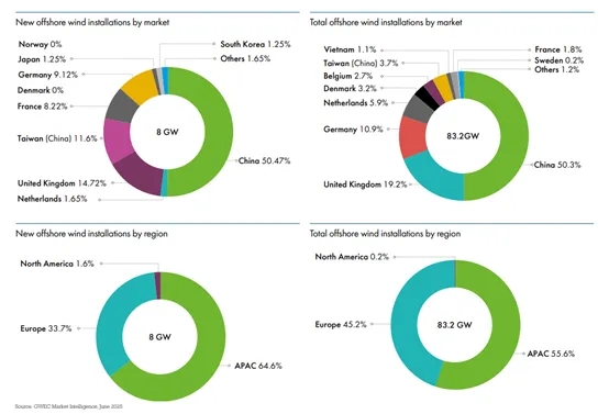 中国连续第七年在新增海上风电装机方面位居榜首,其次是英国、中国台湾、德国和法国,前五大市场在2024年的新增装机容量中占据了94%。