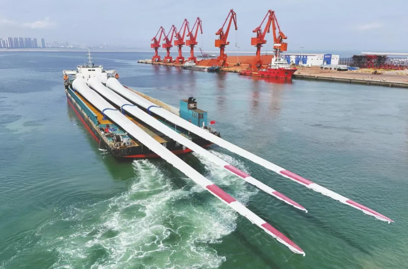 中国风电新闻网讯:8月1日,三条由东方电气自主研发制造的26MW海上风力发电机试验叶片在山东港口烟台港蓬莱港区完成装船并运往试验基地。该型叶片长达153米,重83.5吨,是目前全球最长的海上风电叶片。