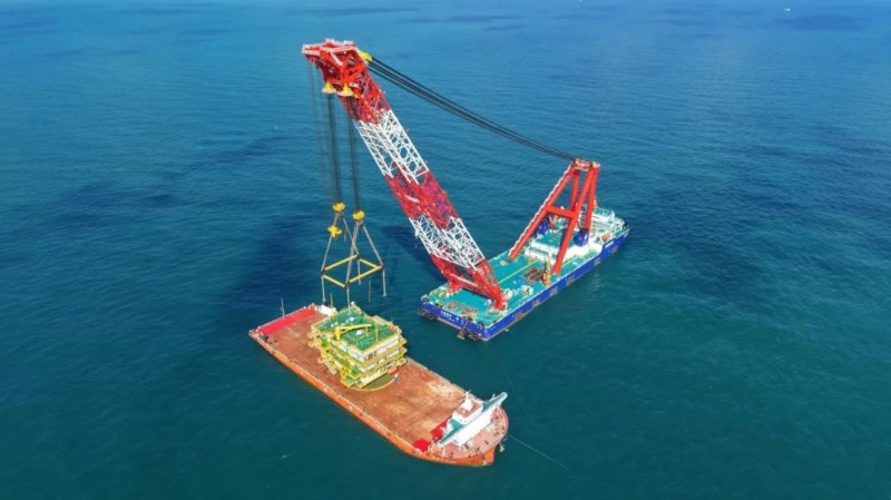 扩建工程建设前期为确保一期项目稳定运行安全,面临已敷设海缆密集、可作业空间有限且台风频发等诸多不利因素。建设团队会同各参建方和外部专家多次就可行性方案进行深入研讨,对海域流速影响、船机性能和站位、吊装角度和起吊顺序、海缆保护和风险应急措施等主要方案进行充分分析和反复论证,最终确定在距离吊装点位1300米,采用固定扒杆式起重船通过抛锚+DP(动力定位)混合作业吊装。项目团队提前谋划,争分夺秒,积极组织船机和施工人员进场,奋战三个昼夜,顺利完成海上升压站安装任务。