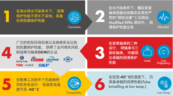 无论是海上风场的盐雾腐蚀,还是北方地区的极寒气候,这款润滑脂在传统的球轴承变桨轴承和最新的三排柱轴承应用中,均展现出卓越性能。获得诸多设备制造商的认证及初装业绩,包括Vestas 三排柱变桨轴承。