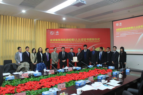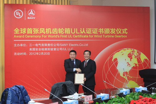 今日,全球产品安全检测和认证领域的领导者UL(Underwriters Laboratories )为中国风电行业的生力军--三一电气有限责任公司(以下简称“三一电气”)颁发全球首张风机齿轮箱UL认证证书。三一电气因此成为国内首家通过UL安全认证成功进入北美市场的中国风机制造商,这将增强其风电产品在北美以及国际市场的竞争力,为其国际化布局带来重要市场信心。UL全球副总裁兼大中华区总裁周威方与三一电气总经理吴佳梁出席了证书颁发仪式。