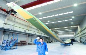 重通集团制造的长达50米的风力发电机巨型叶片。 重庆晨报记者 杨新宇 摄