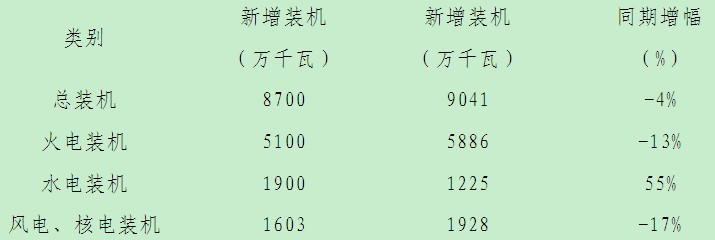 2013年全国能源工作会议提出,2013年我国发电将新增装机9000万千瓦,其中火电3600万千瓦、水电2100万千瓦、风电1800万千瓦、光伏发电1000万千瓦、核电324万千瓦,非化石能源占当年装机总量的58%。而据中国电器工业协会预测,2013年发电设备产量将达到1.1亿——1.2亿千瓦,其中火电5000万千瓦、水电2500万千瓦、风电1500万千瓦、核电1000万千瓦、光伏发电500万千瓦。