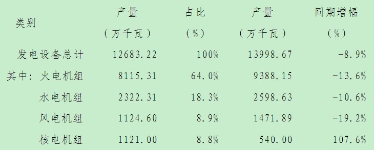 表1 2012年我国发电设备生产构成情况