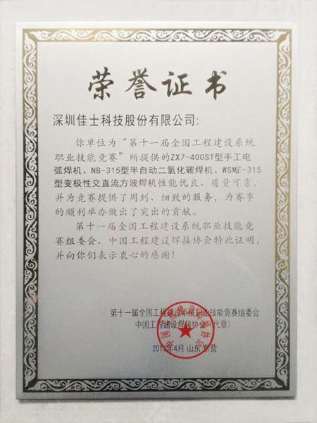 据悉,全国工程建设系统职业技能竞赛自1993年开始,每两年举行一次,目前已发展成为涵盖冶金、石化、船舶、水电等十六个工程建设领域的重大赛事之一。深圳市佳士科技股份有限公司为第十一届全国工程建设系统职业技能竞赛所提供的ZX7-400ST型手工电弧焊机、NB-315型半自动二氧化碳焊机、WSME-315型变极性交直流方波焊机性能优良、质量可靠,并为竞赛提供了周到、细致的服务,为赛事的顺利举办做出了突出的贡献。为此,第十一届全国工程建设系统职业技能竞赛组委会、中国工程建设焊接协会表达了谢意,并颁发了荣誉证书。