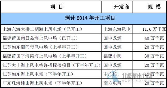 1、预计2014年开工海上风电项目