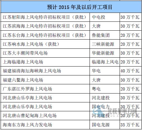 2、预计2015年及以后开工海上风电项目