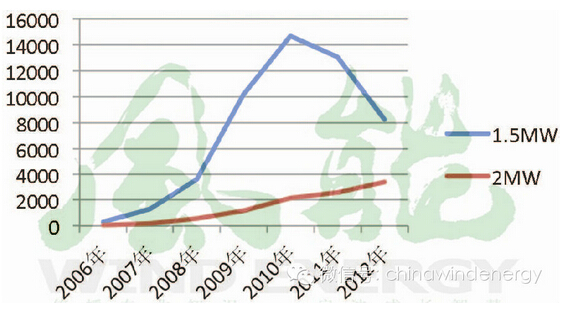 图1 2006年至2012年1.5MW和2MW型机组新增装机容量趋势(单位:MW)