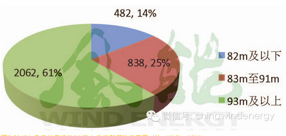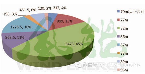 图5 2012年各风轮直径2MW风电机组新增装机容量对比(单位:MW)