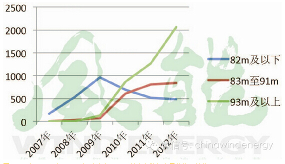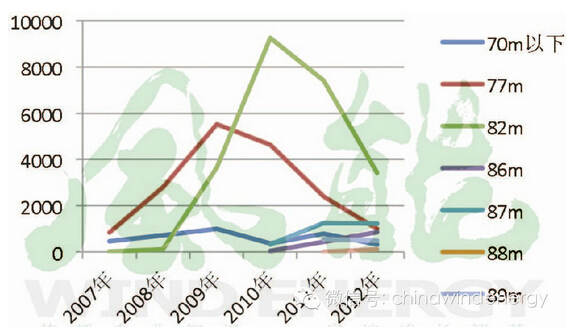 图4 2007年至2012年2MW型风电机组不同风轮直径装机容量趋势(单位:MW)