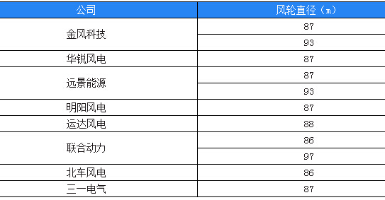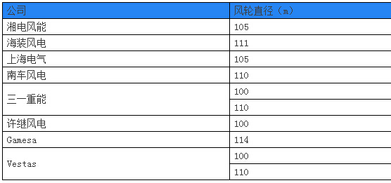 在生产2MW 机组的整机商中,南车风电、三一重能、Vestas 分别推出了风轮直径达110m 的产品,海装风电推出了风轮直径111m 的2MW机组,Gamesa 则推出了114m 风轮直径的2MW 机组。