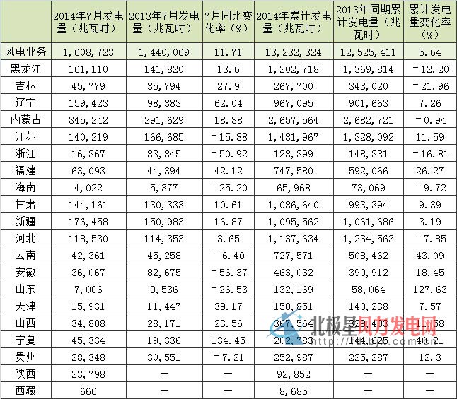 北极星风力发电网根据公开文件获悉,龙源电力2014年7月完成风电发电量1608723兆瓦时,同比增长11.71%。截至2014年7月底,龙源电力今年累计完成风电发电量13232324兆瓦时,较上年同比增长5.64%。