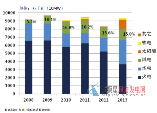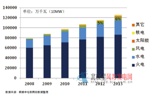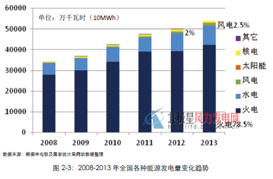 图3:2008-2013 年全国各种能源发电量变化趋势