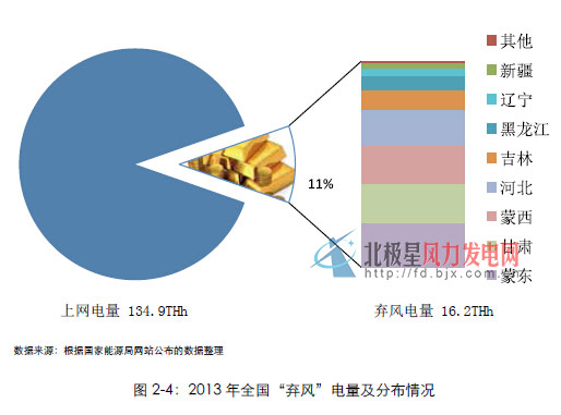与2012 年的20TWh 相比,2013 年全国“ 弃风” 损失达16.2TWh, 形势有所好转但依然严峻。其中蒙东电网2013 年“ 弃风” 电量3400GWh, 甘肃3100GWh, 蒙西2990GWh, 河北2800GWh, 吉林1572GWh, 黑龙江1151GWh, 辽宁528GWh, 新疆431GWh。2013 年全国风电弃风电量及分布如图2-4。以上地区是我国风能资源最为丰富的地方,“弃风限电”不仅影响到开发商投资收益,更影响到我国风电开发进度。