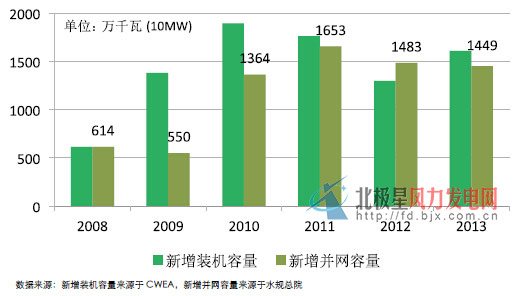 图2:2008-2013 中国风电新增装机容量和并网容量