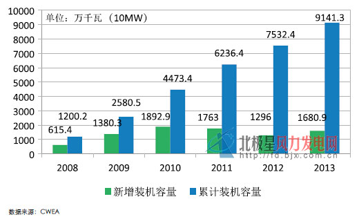 图1:2008-2013 年中国风电新增及累计装机容量趋势图