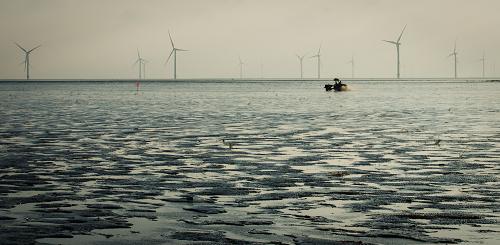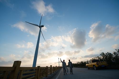 10月12日,在江苏如东洋口渔港,一辆海上拖拉机驶过退潮后的海堤,背景为潮间带风力发电场。作为江苏风力发电“海上三峡”工程的主战场,南通市如东县目前已建成风电场10座,安装风电机组569台。据统计,该县2014年前三季度上网绿色电能10.41亿千瓦时,相当于该县同期供电量的三分之一。