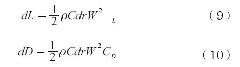距离叶根r处,作用在叶片长度为dr的升力和阻力分别为: