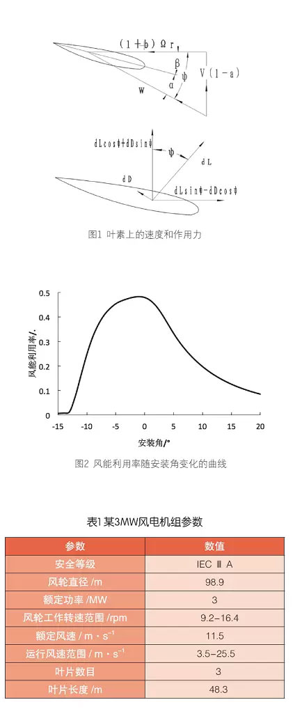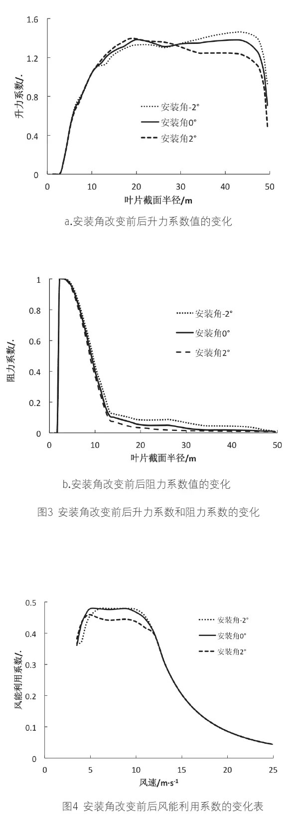 (1)基于叶素动量理论及其修正理论,以某3MW 风电机组为例,在GH -Bladed 软件中模拟了叶片安装角在-2°、0°、2°情况下,叶片安装误差对风电机组升阻力系数、风能利用系数、功率等性能参数引起变化的情况。