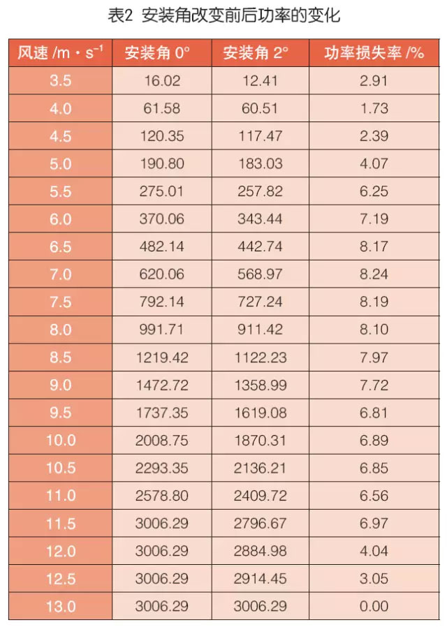 从上面计算的数值可看到,叶片安装角在2°情况下风电机组损失的年发电量为安装角为0°时的3.6% 。