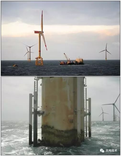 海上风电场的防腐尽管可以在很大程度上参考海洋平台现有的防腐经验,但是两者之间也有不同。海上风电场是无人居住的,并且严格限制人员的接近。海洋平台上的防腐涂层更容易进行有计划的检查和维修,受到腐蚀时可以随时修补,而海上风电场很难做到这一点,维修费用极高,后续维护费用是其成本的7倍以上。对海上风电机组钢结构腐蚀应更加重视,特别是外露于海洋大气和飞溅区中的部位。一般情况下,大气区结构件采取涂料保护或热喷涂金属保护,如:大气区钢结构一般采用环氧富锌底漆(含锌≥80%)、环氧云铁漆、聚氨酯面漆(或者聚氨酯+氟碳双重面漆)三层涂层体系;飞溅区钢结构一般采用玻璃鳞片漆、环氧耐磨漆双层涂层体系;全浸区一般采用玻璃鳞片漆、环氧厚浆漆双层涂层体系,并采取牺牲阳极进行协同防腐。